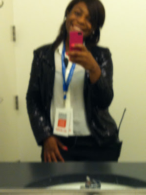 Its blurry! But instead of a boring black suit we were required to where. I wore black slacks with a sequin black blazer! Yes! I worked it!