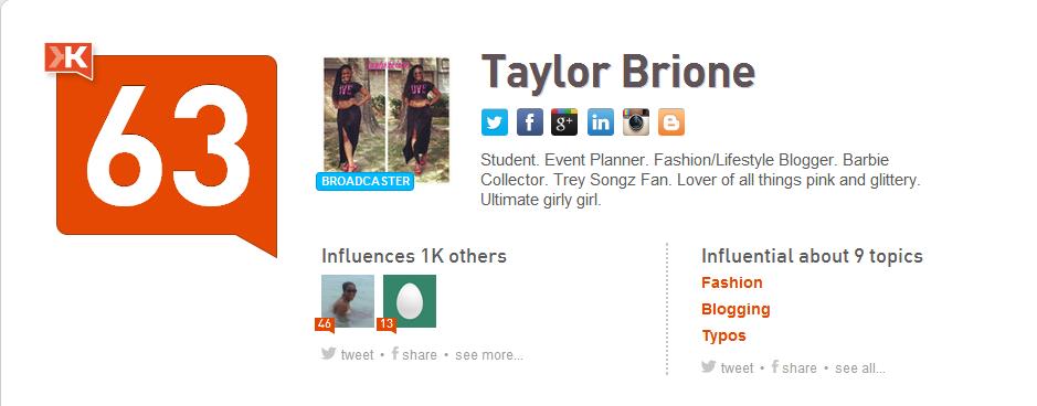 I was really late on the Klout train. One of my PR friends was talking to me about blogging and social media, and she randomly asked what was my Klout score? I had no idea what she was talking about! In true form I went straight to Google to find that Klout was “the standard for influence” in social networking. As a blogger, I needed to jump on this immediately!